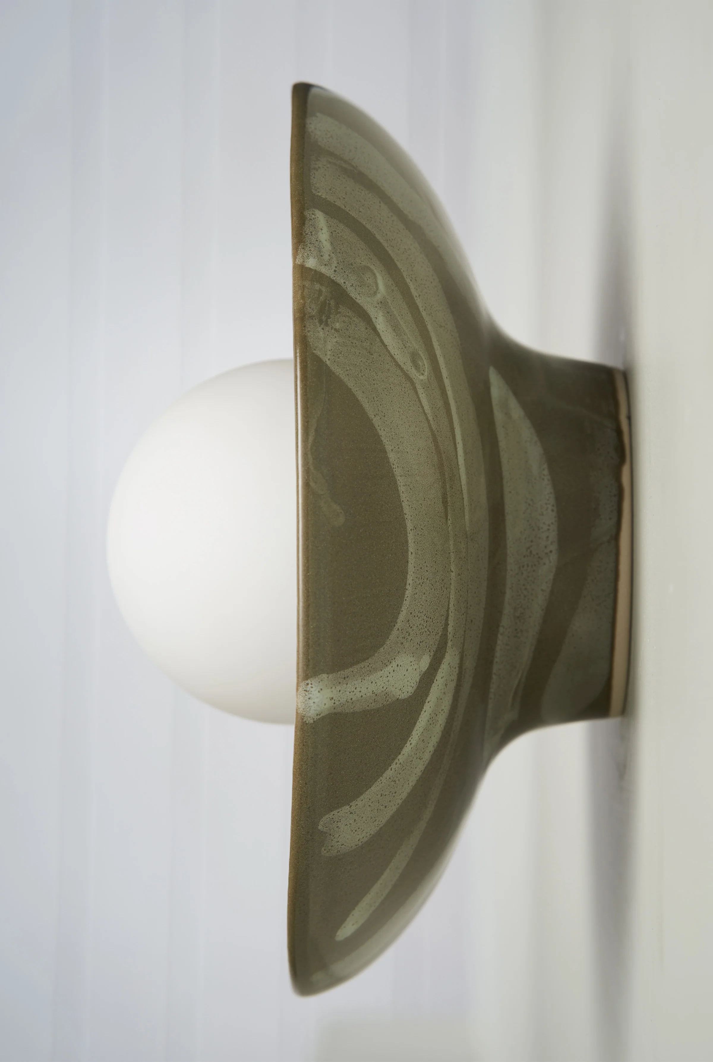 A simple dish frames a ball light to create a sweet wall sconce. Each dish is crafted by hand in our Melbourne workshop and available in eight hand glazed finishes. No two are alike.
